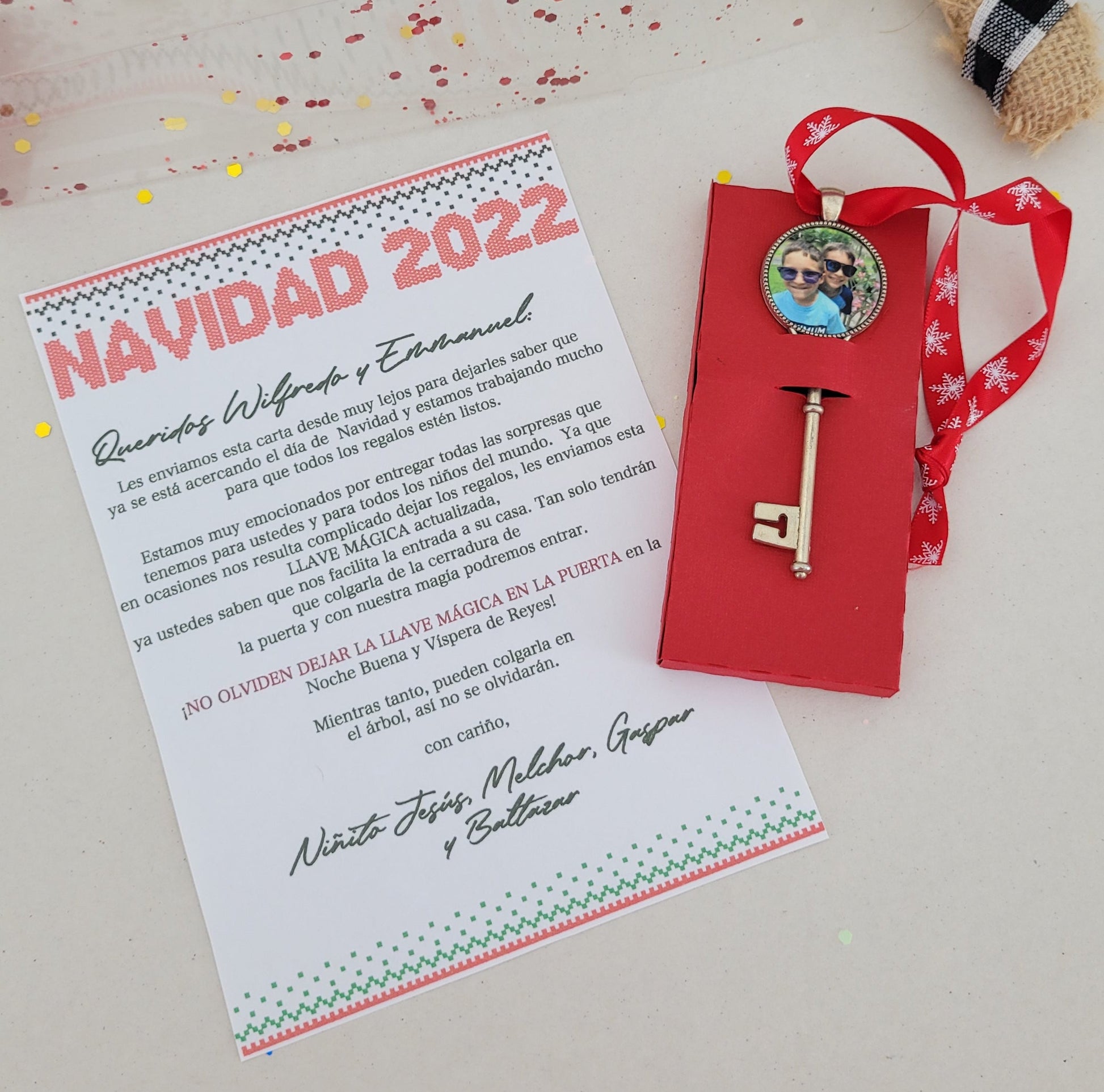 Puede llevar el mismo mensaje de la foto u otro. También las trabajamos con fotos o nombres para que Santa y los Reyes Magos puedan utilizar la llave mágica para entrar más fácil a la casa 🙌